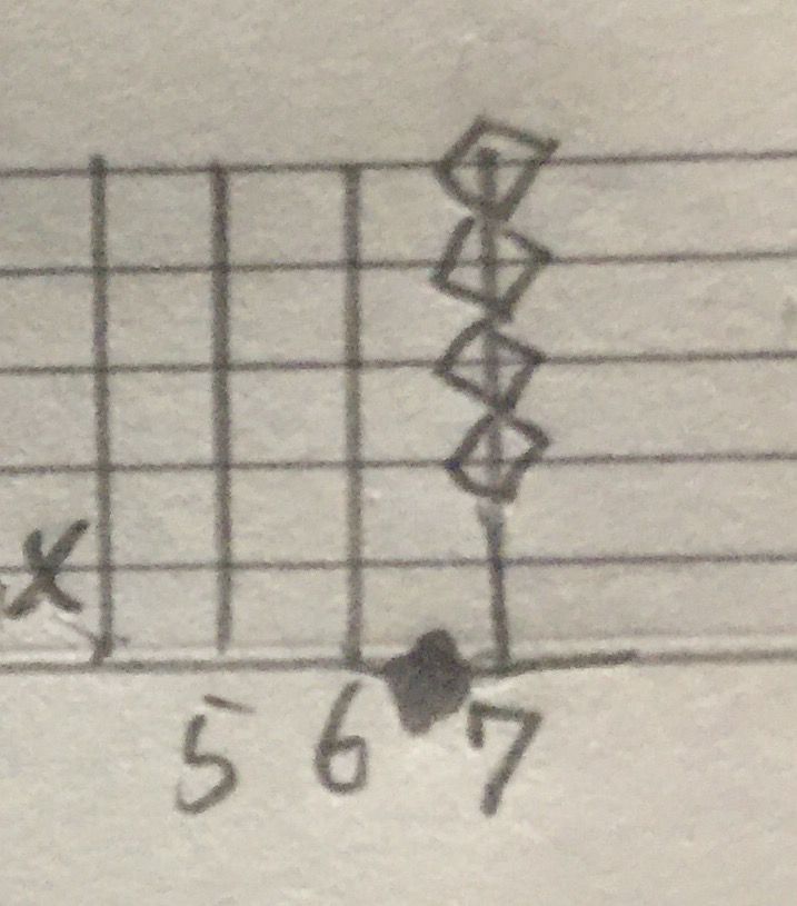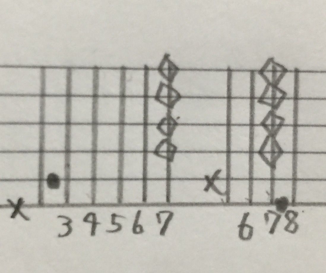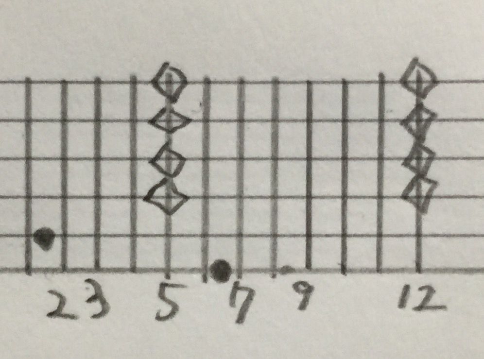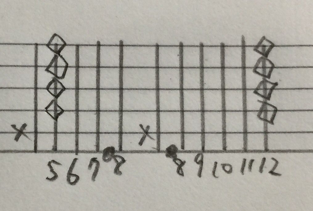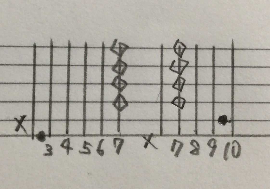 ひし形みたいなのは、ハーモニクスです。つまり6弦8フレットを押さえながら、