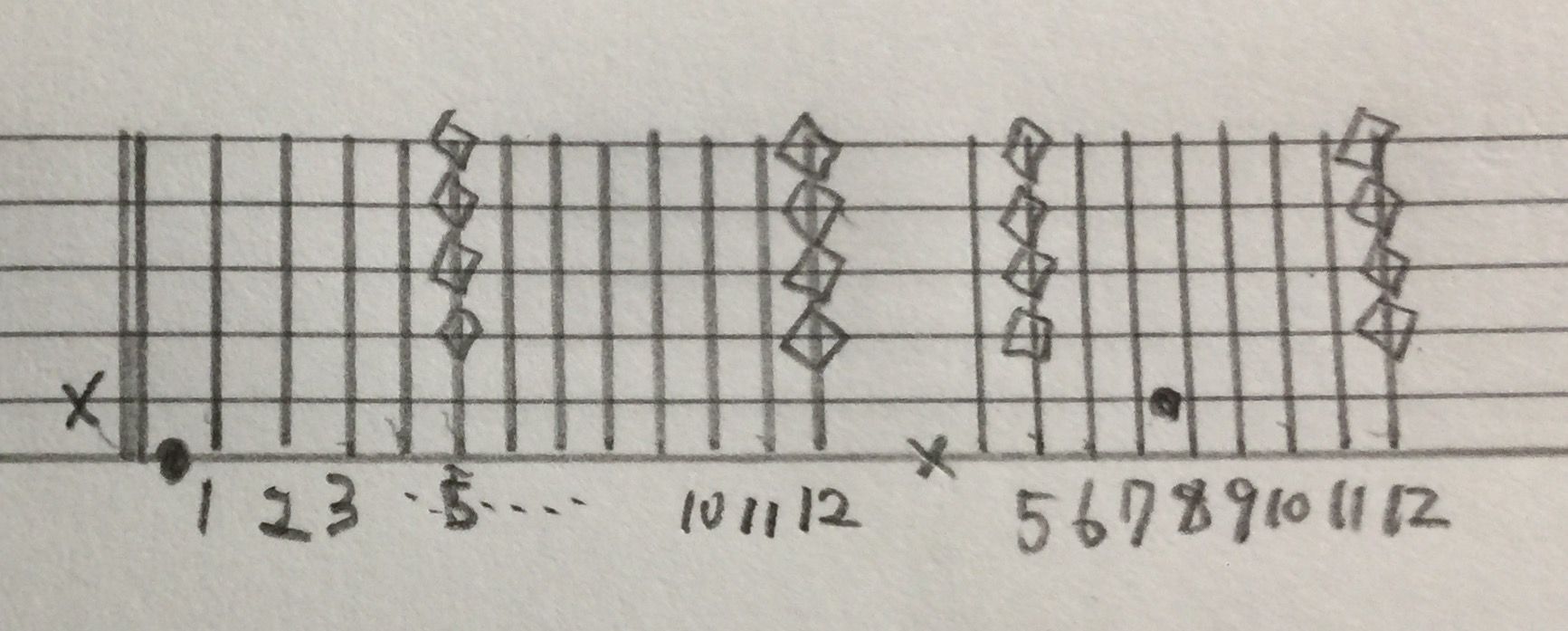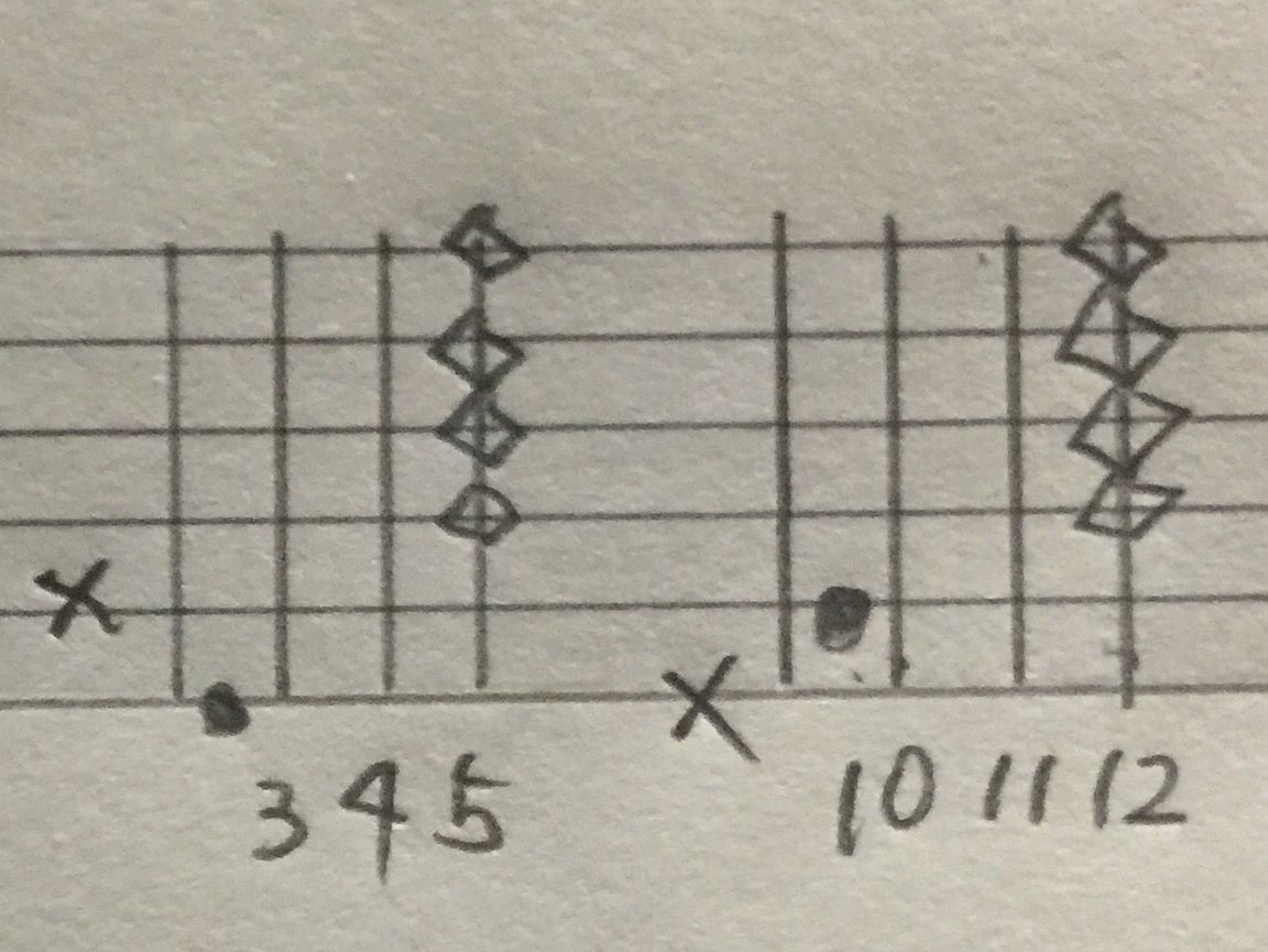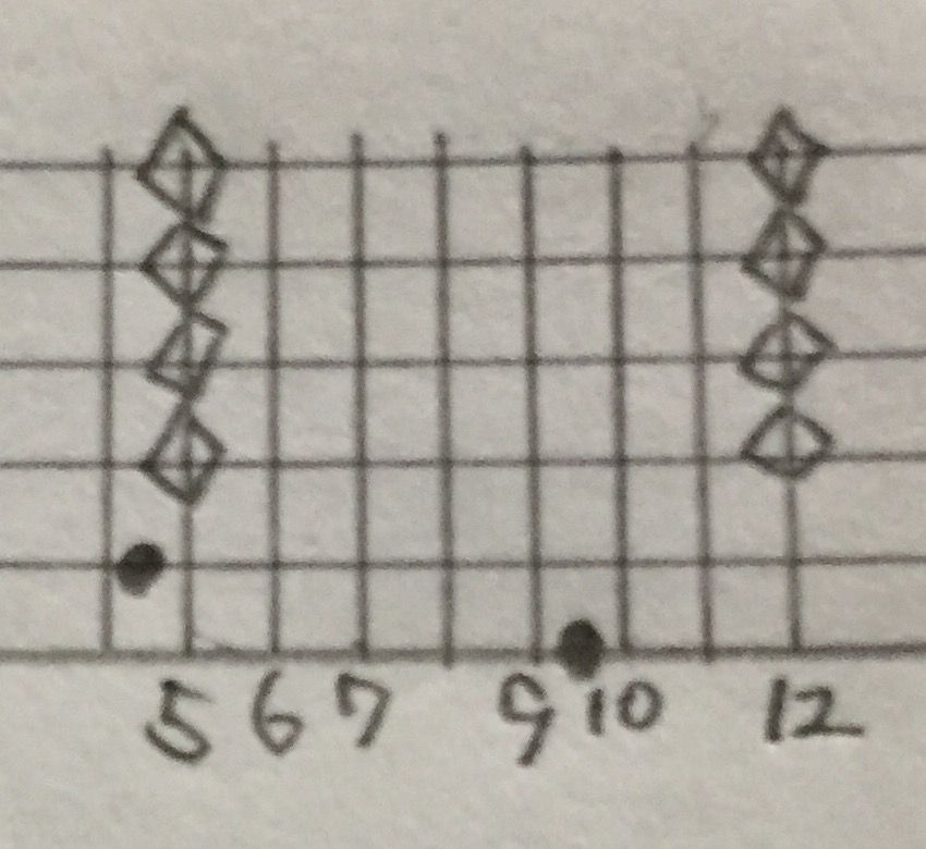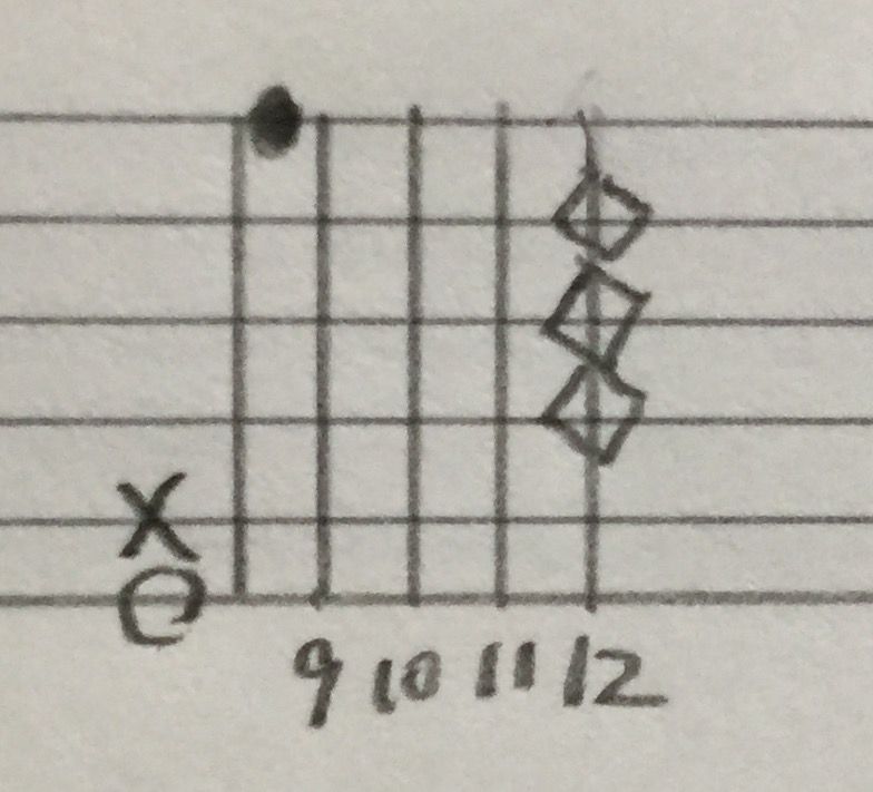 ひし形みたいなのは、ハーモニクスです。つまり6弦8フレットを押さえながら、